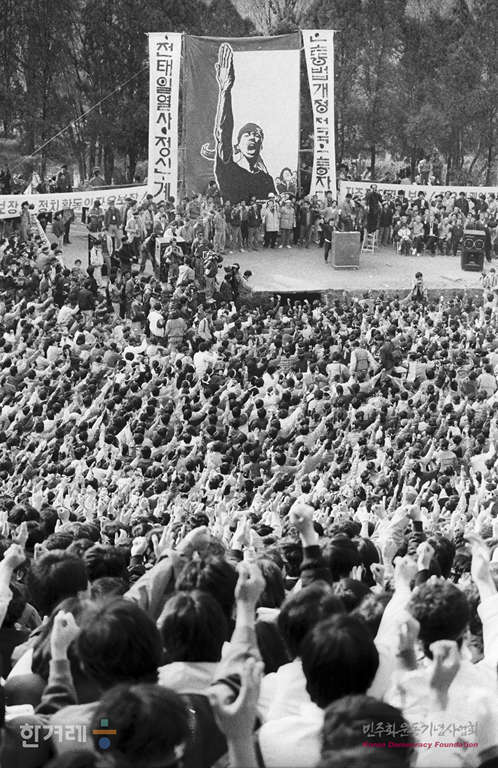 - 1988년 11월 13일 전국의 노동자 시민 학생 등 3만5천여명이 모인 서울 연세대 노천극장에서 ‘전태일 열사 정신 계승 노동악법개정 전국노동자대회’를 갖고 전태일 정신 계승하여 노동3권 쟁취하자‘고 외치고 있다.