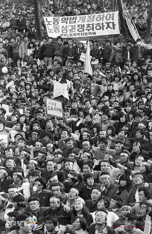 - 1988년 11월 13일 전국의 노동자 시민 학생 등 3만5천여명이 모인 서울 연세대 노천극장에서 ‘전태일 열사 정신 계승 노동악법개정 전국노동자대회’를 갖고 전태일 정신 계승하여 노동3권 쟁취하자‘고 외치고 있다.