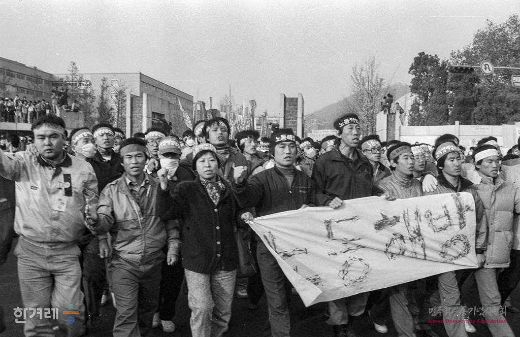 - 1988년 11월 13일 전국의 노동자 시민 학생 등 3만5천여명이 모인 서울 연세대 노천극장에서 ‘전태일 열사 정신 계승 노동악법개정 전국노동자대회’를 갖고 전태일 정신 계승하여 노동3권 쟁취하자‘고 외치고 있다.