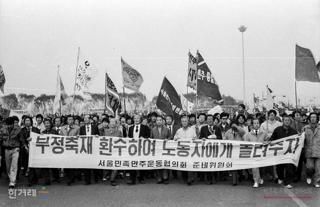 - 1988년 11월 13일 전국의 노동자 시민 학생 등 3만5천여명이 모인 서울 연세대 노천극장에서 ‘전태일 열사 정신 계승 노동악법개정 전국노동자대회’를 마치고 참석자 여의도 국회의사당 앞까지 평화행진을 하고 있다.