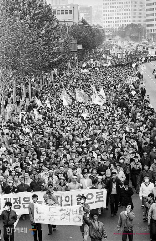 - 1988년 11월 13일 전국의 노동자 시민 학생 등 3만5천여명이 모인 서울 연세대 노천극장에서 ‘전태일 열사 정신 계승 노동악법개정 전국노동자대회’를 마치고 참석자 여의도 국회의사당 앞까지 평화행진을 하고 있다.