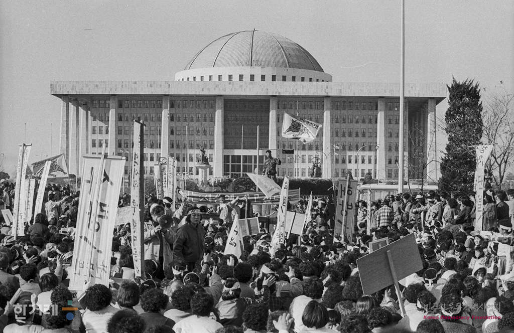 - 1988년 11월 16일 서울 서대문구 대현동 구로구 구로3동 등 수도권지역 20여개 재개발지구 세입자 및 철거지역 이주민 등 1천여명이 서울 여의도 순복음교회 앞마당에서 ’제5,6공화국 재개발비리만행 폭로규탄 및 깡패철거 결사저지 결의대회‘를 하고 있다.