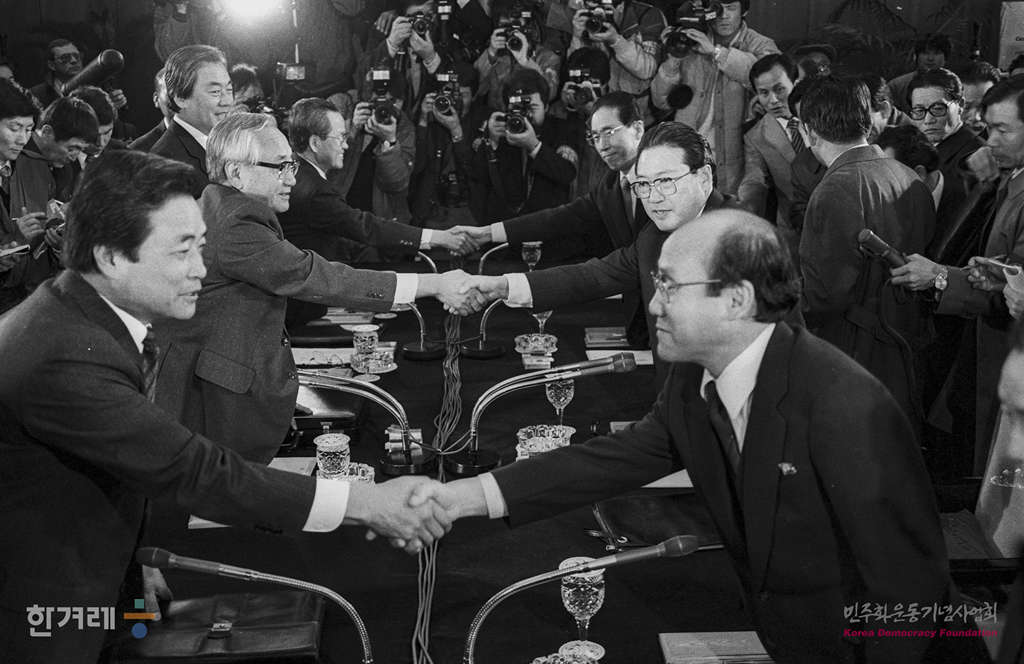 - 1988년 11월 17일 오전 10시 판문점내 우리쪽지역 자유의 집에서 열린 남북한 국회회담을 위한 제6차 준비접촉에 앞서 인사를 나누고 있다.