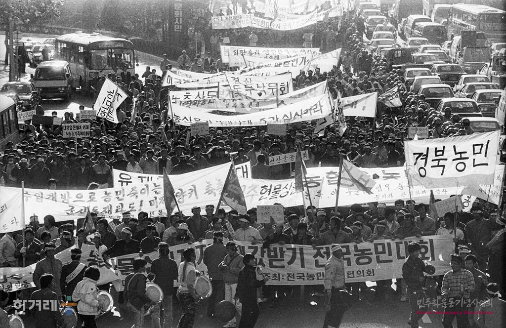 - 1988년 11월 17일 오후 전국 곳곳에서 올라온 농민 1만여명은 여의도 광장에 모여 농축산물수입개방저지 및 제값받기 전국농민대회를 마친뒤 광화문쪽으로 행진을 하고 있다.