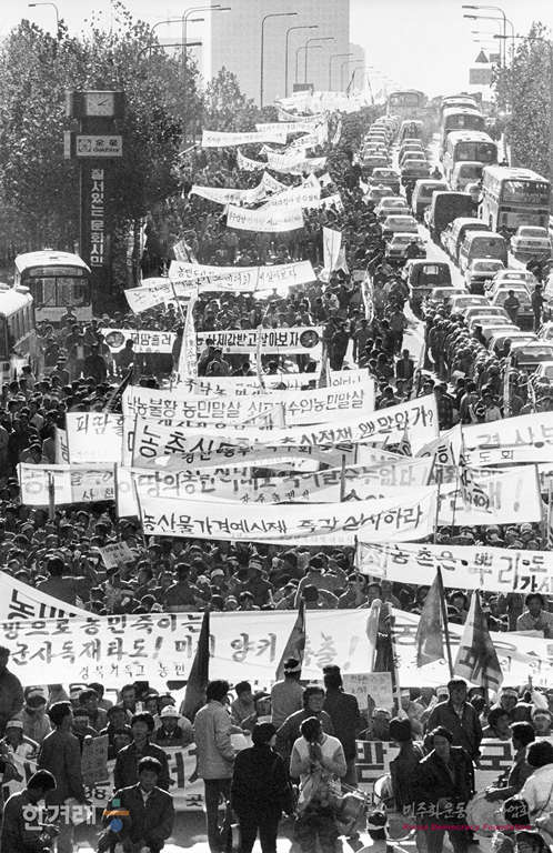- 1988년 11월 17일 오후 전국 곳곳에서 올라온 농민 1만여명은 여의도 광장에 모여 농축산물수입개방저지 및 제값받기 전국농민대회를 마친뒤 광화문쪽으로 행진을 하고 있다.