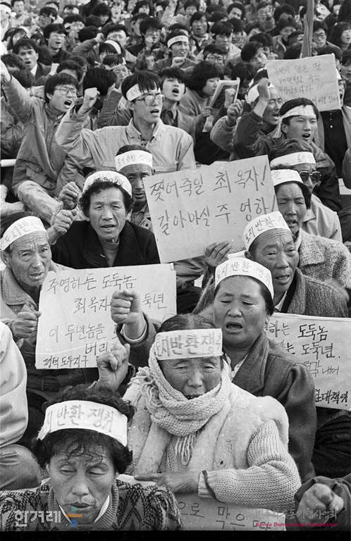 - 1988년 11월 17일 오후 전국 곳곳에서 올라온 농민 1만여명은 여의도 광장에 모여 농축산물수입개방저지 및 제값받기 전국농민대회를 하고 있다.