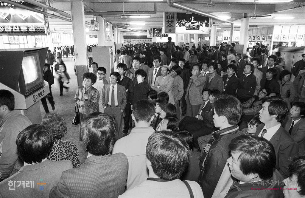 - 1988년 11월 18일 80년 광주항쟁의 진상을 밝히기 위한 국회 청문회가 생방송되는 가운데 서울 고속버스터미널에서는 많은 승객들이 텔레비전앞에 모여 실황을 지켜보고 있다.