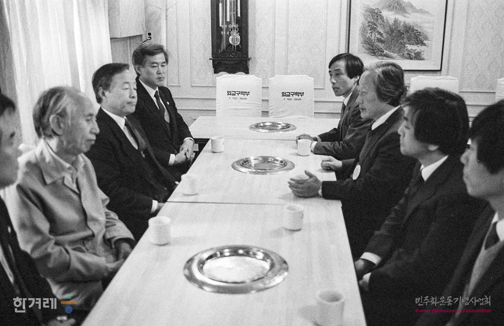 - 1988년 11월 18일 오후 전두환 이순자 구속처벌을 위한 투쟁본부 공동의장들이 서울 여의도 한 음식점에서 김영삼 민주당 총재를 만나 전이부부 구속투쟁에 동참해 줄 것을 요구하며 회의를 하고 있다.