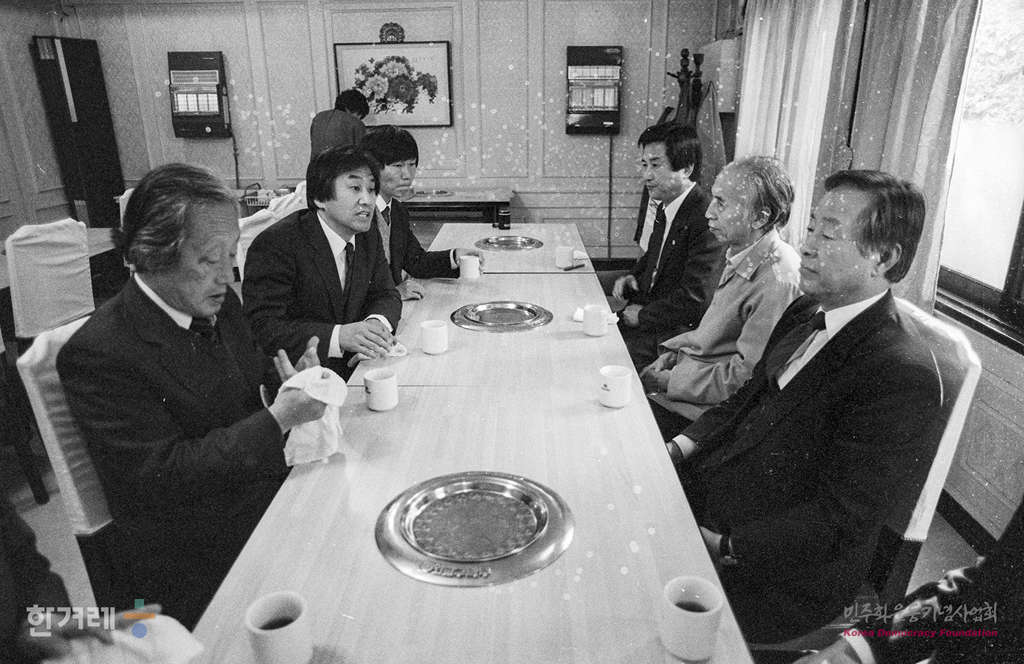 - 1988년 11월 18일 오후 전두환 이순자 구속처벌을 위한 투쟁본부 공동의장들이 서울 여의도 한 음식점에서 김영삼 민주당 총재를 만나 전이부부 구속투쟁에 동참해 줄 것을 요구하며 회의를 하고 있다.
