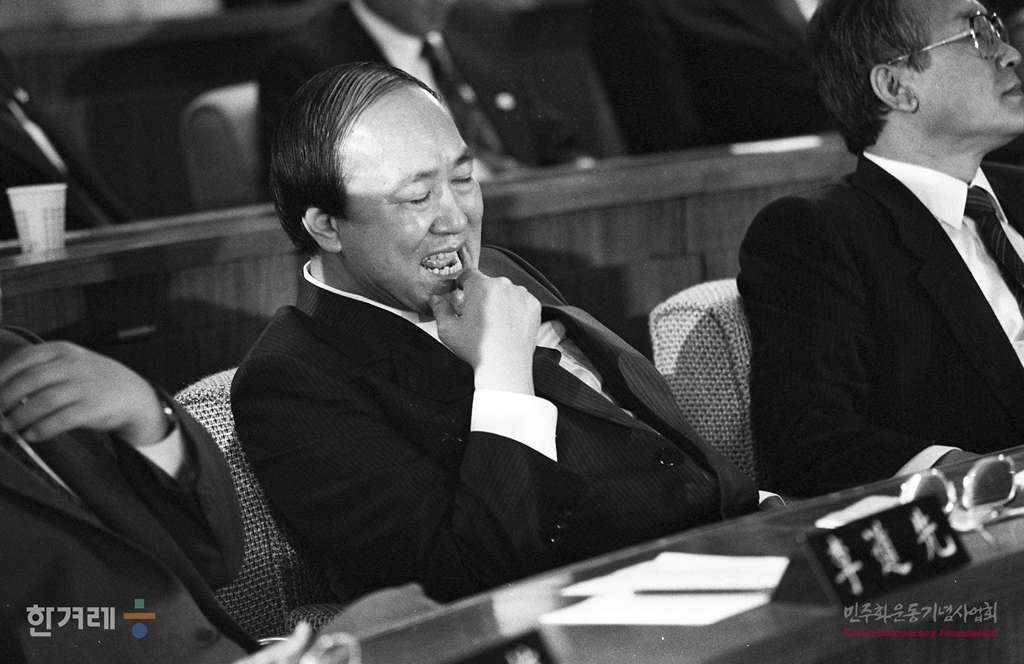 - 1988년 11월 19일 광주항쟁의 진상규명을 위한 1차 청문회가 열린 국회 광주특위에서 열였다. 권정달 여당의원이 당시 계엄사에 의해 구속됐던 김대중 평민당 총재가 증언을 듣고 있다.
