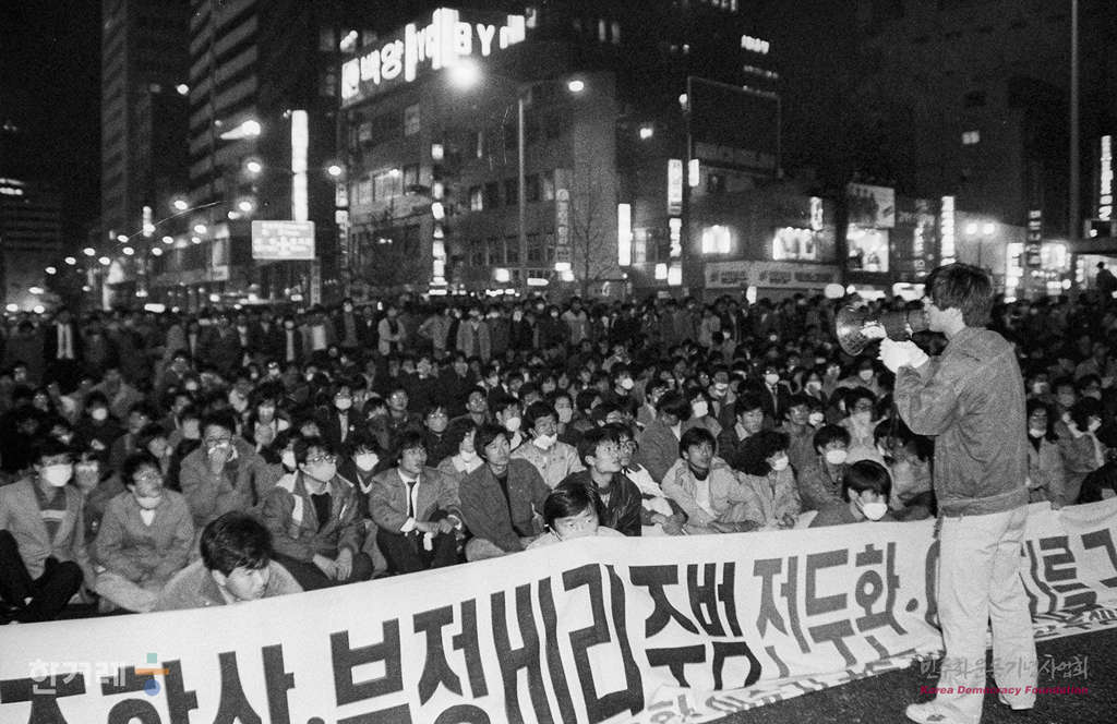 - 1988년 11월 19일 전두환 이순자씨의 구속처벌을 요구하는 국민궐기대회가 서울 대학로를 비롯한 전국 18개 도시에서 시민 학생 노동자 등 모두 3만여 명이 참가한 가운데 열려 시민과 경찰의 충돌을 빚었다. 서울 대학로에서 대회를 마친 참석자들은 행진에 나서 명동입구에서 거리시위를 벌이고 있다. .
