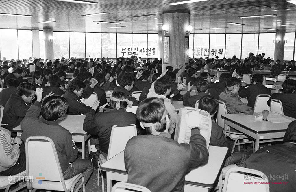 - 1988년 11월 19일 지난 11일부터 8일째 전 현직 노조간부 부장인사 철회를 주장하며 농성을 벌이던 서울 지하철노조 차량지부 조합원 8백여명은 서울 용답동 차량기지 후생관에서 총회를 열고 있다.