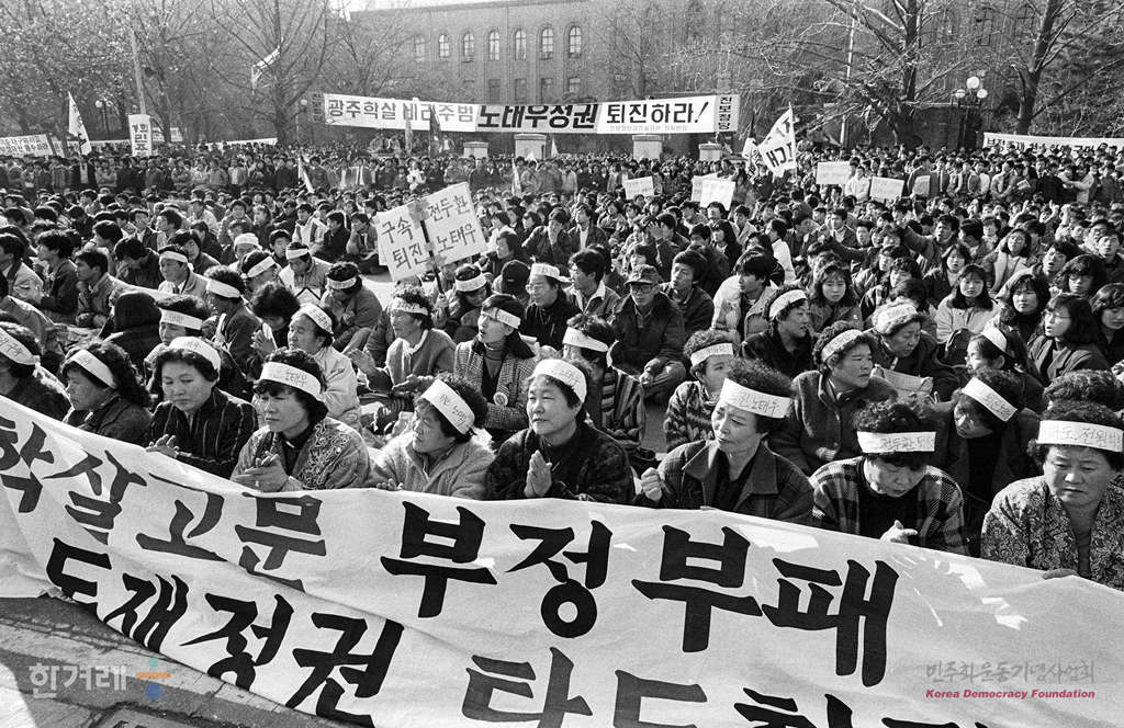 - 1988년 11월 19일 전두환 이순자씨의 구속처벌을 요구하는 국민궐기대회가 서울 대학로를 비롯한 전국 18개 도시에서 시민 학생 노동자 등 모두 3만여 명이 참가한 가운데 열려 시민과 경찰의 충돌을 빚었다. 서울 대학로에서 대회에서는 1만 3천여명이 참석한 가운데 전씨부부의 구속을 요구하고 있다.