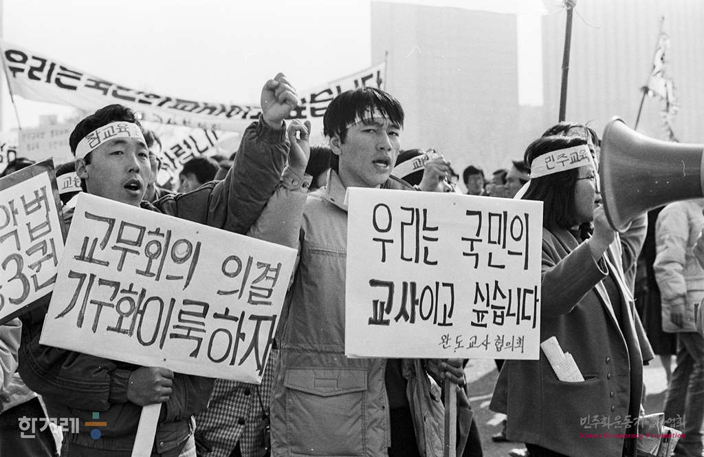 - 1988년 11월 20일 오후 2시 전국에서 모인 초 중 고 교사 및 대학생 교수 등 1만 2천여명이 서울 여의도광장 모여 참교육실천을 위한 민주교육법 쟁취 전국교사 대회를 열고 비민주적인 교육악법의 철폐와 교육관계법 개정 등을 요구하고 있다.