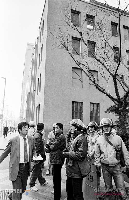 - 1988년 11월 21일 서울 중구 을지로1가 미문화원 도서관으로 통하는 서쪽 문에서 대학생 20여명이 사제 폭름탄과 화염병을 터뜨리며 기습점거를 하자 경찰이 병력을 늘리고 있다. 이날 학생들이 기습점거를 한 뒤 사과탄을 던지며 진입, 차례로 학생들을 연행했다.