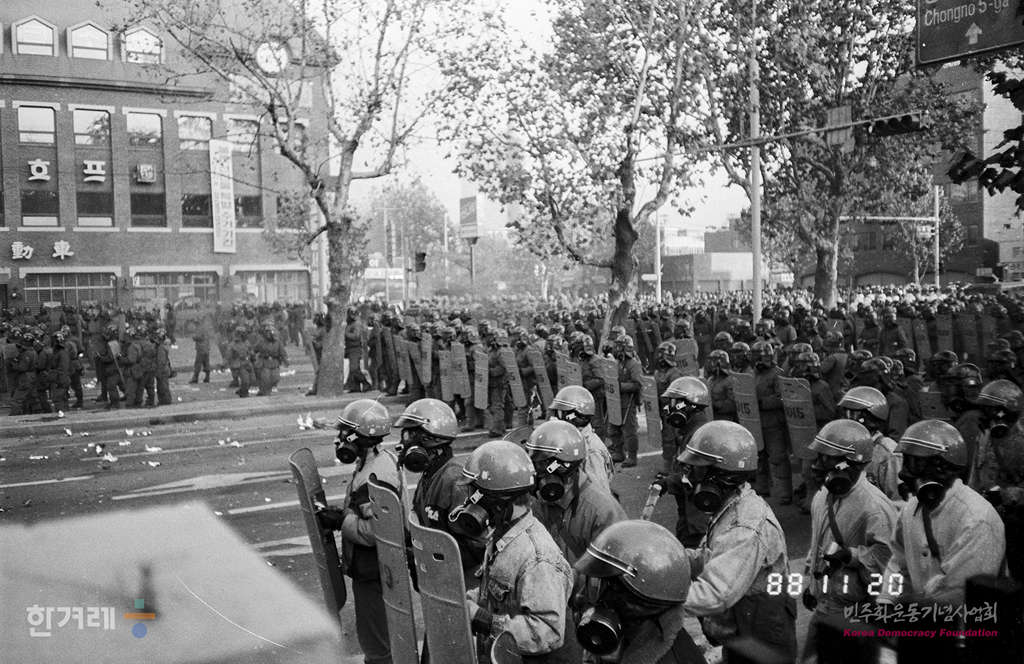 - 1988년 11월 19일 전두환 이순자씨의 구속처벌을 요구하는 국민궐기대회가 서울 대학로를 비롯한 전국 18개 도시에서 시민 학생 노동자 등 모두 3만여 명이 참가한 가운데 열려 시민과 경찰의 충돌을 빚었다. 서울 대학로에서 대회를 마친 참석자들은 연희동 전씨 집까지 구속을 촉구하는 평화대행진에 나서자 경찰들이 행진을 막히자 일부 참가자들이 화염병을 던지고 있다.