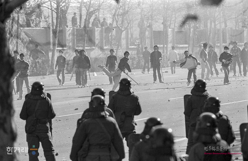 - 1988년11월 23일 전두환씨가 연희동 사과담화를 발표뒤 백담사로 집을 떠난 것으로 알려지자 서총련 체포결사대 소속 연세대생 1벽여명은 전씨 부부가 탄 차량을 습격하려다 경찰의 저지를 받자 돌과 화염병을 던지며 격력한 시위를 벌이고 있다.