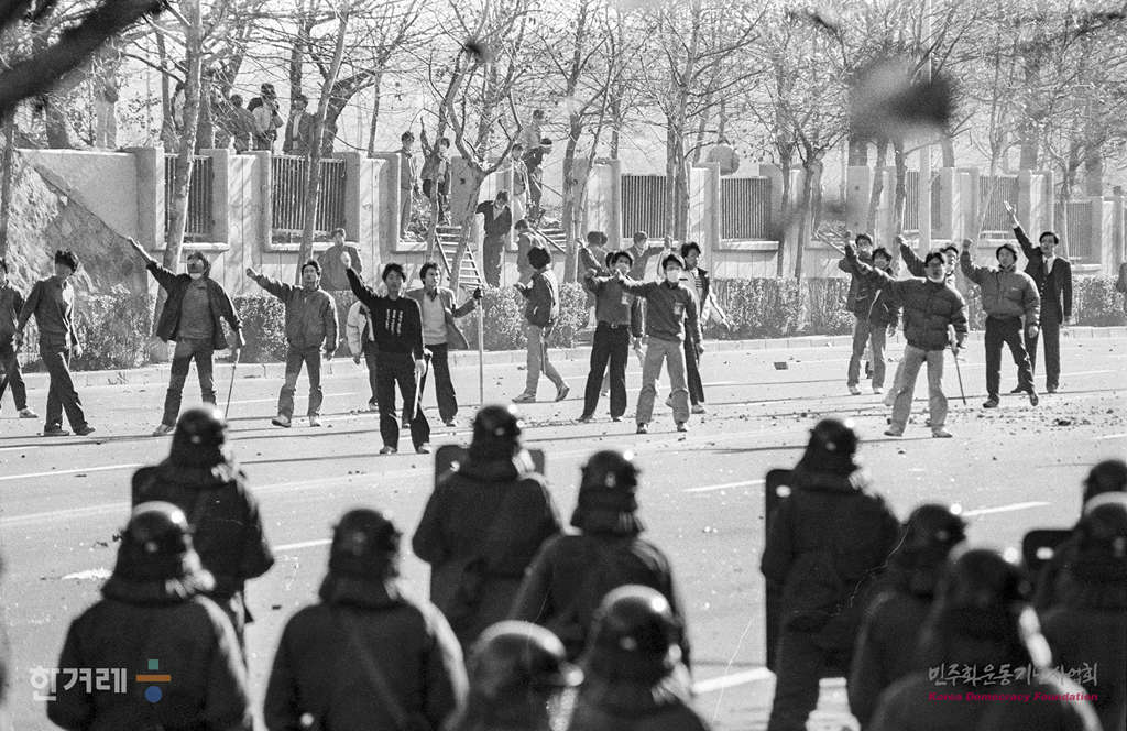 - 1988년11월 23일 전두환씨가 연희동 사과담화를 발표뒤 백담사로 집을 떠난 것으로 알려지자 서총련 체포결사대 소속 연세대생 1벽여명은 전씨 부부가 탄 차량을 습격하려다 경찰의 저지를 받자 돌과 화염병을 던지며 격력한 시위를 벌이고 있다.