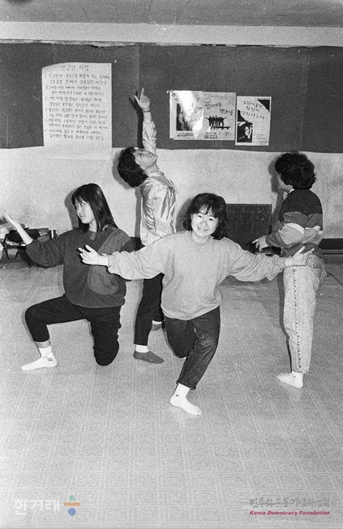 - 1988년 11월 23일 한국여성노동자회 회원들이 서울 예술극장 한마당에서 열리는 여성노래한마당에 출연하기 위해 노래극 연습을 하고 있다. 여성노래한마당 행사는 여성노동자 복지회관 건립을 위한 특별공연의 하나로 지난달 마당극 <껍데기를 벗고서>에 이은 두 번째 공연이다.