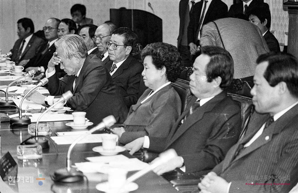 - 1988년11월 23일 전두환 전 대통령은 연희동 자택에서 국민여러분께 드리는 말씀을 발표하자 민정당은 정호용 의원을 제외한 중집위원 24일 증앙당사 중집위원실에 집결해 전씨의 대국민 사과문을 발표한 뒤 사저를 떠나는 모습을 침울한 모습으로 텔레비전을 지켜보고 있다.