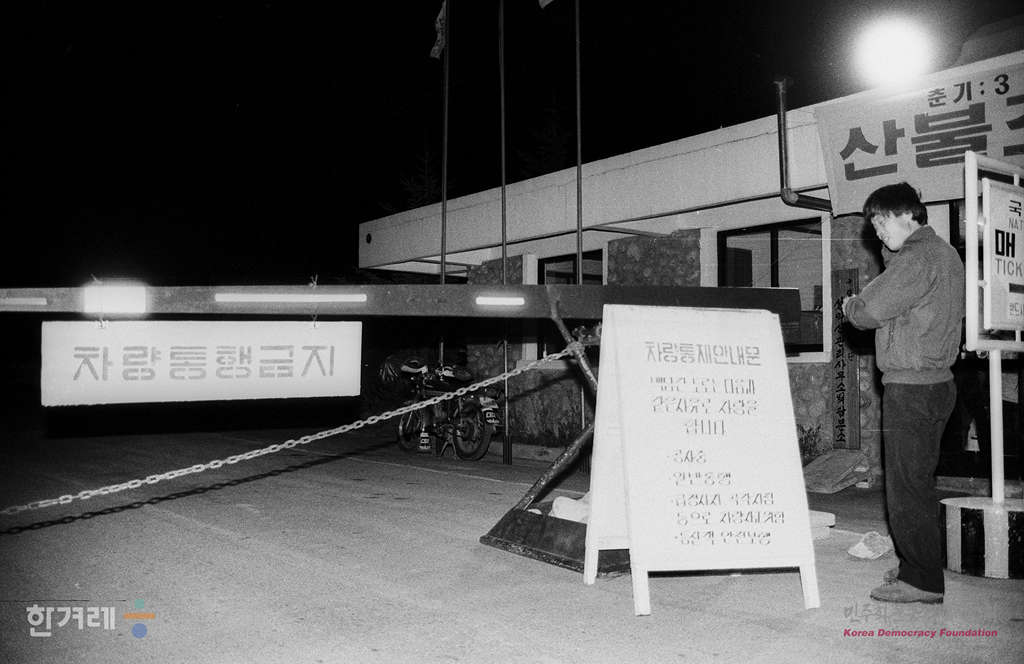 - 1988년 11월 24일 전두환 전 대통령 부부가 23일 오후부터 머물고 있는 강원도 인제군 백담사에서 7km 떨이진 관리사무소에 관리자들이 출입을 통제하는 안내판을 내놓고 있다. 이날 경찰은 12명씩 1개 분대가 배치됐고 절 경내와 입구에 소화기를 새로 놓고 경비를 강화하고 있다.
