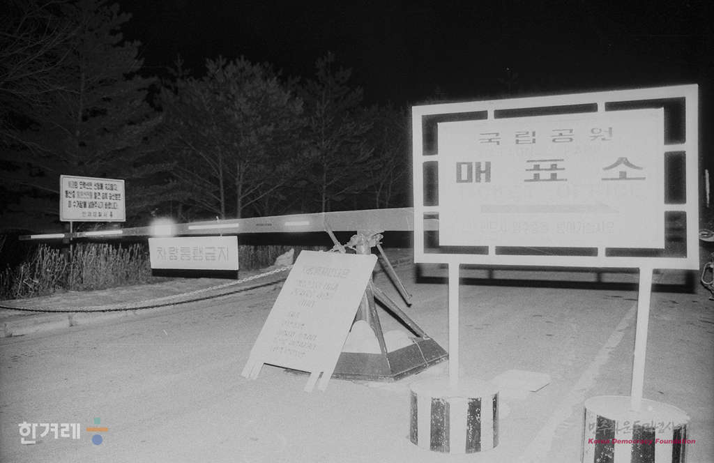 - 1988년 11월 24일 전두환 전 대통령 부부가 23일 오후부터 머물고 있는 강원도 인제군 백담사에서 7km 떨이진 관리사무소에 관리자들이 출입을 통제하는 안내판을 내놓고 있다. 이날 경찰은 12명씩 1개 분대가 배치됐고 절 경내와 입구에 소화기를 새로 놓고 경비를 강화하고 있다.