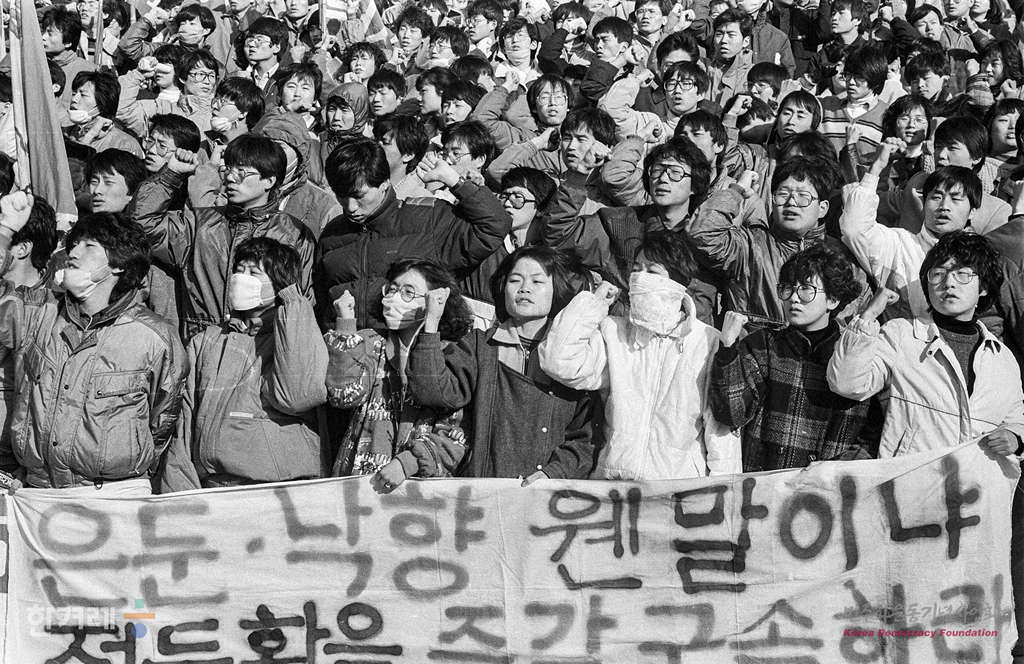 - 1988년 11월 25일 전두환씨의 사과 해명에도 불구하고 전씨 부부의 구속처벌을 요구하는 성명과 시위가 잇따르는 가운데 서울 연세대에서 학생 노동자 시민들이 전이부부 즉각구속과 노태우 정권규탄 제3차 국민궐기대회 출정식을 하고 있다.