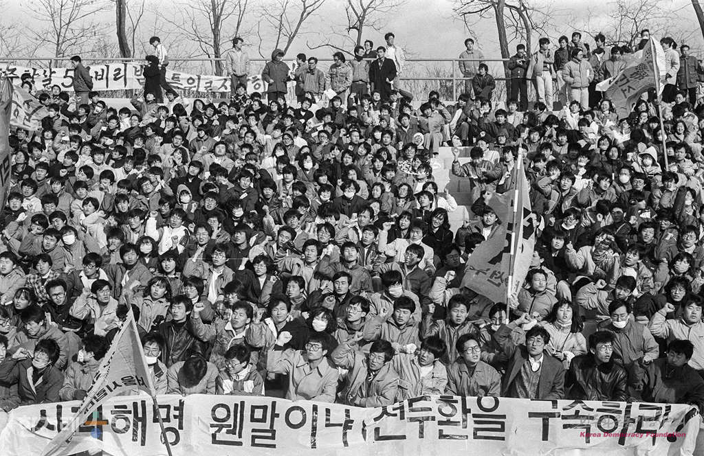 - 1988년 11월 25일 전두환씨의 사과 해명에도 불구하고 전씨 부부의 구속처벌을 요구하는 성명과 시위가 잇따르는 가운데 서울 연세대에서 학생 노동자 시민들이 전이부부 즉각구속과 노태우 정권규탄 제3차 국민궐기대회 출정식을 하고 있다.