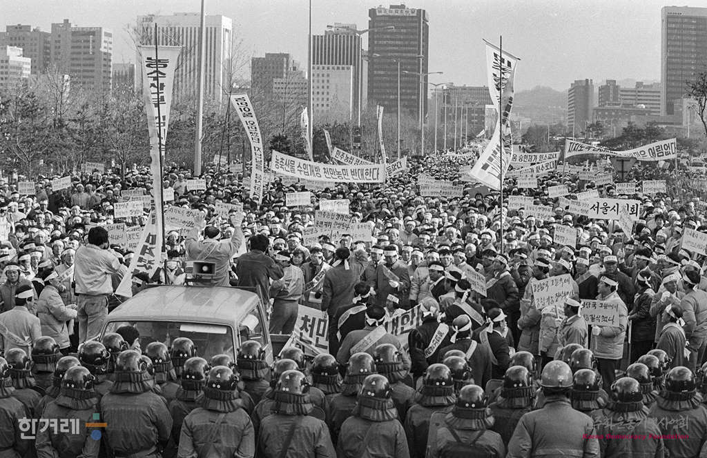 - 1988년 11월 25일 농협의 민주화와 정부간섭배제를 요구하는 농협 민주화 촉구 전국농민조합원 및 조합장궐기대회가 서울 영등포구 여의도동 KBS앞 광장에서 전국 1천4백 68개 단위농협 조합장과 직원등 1만여 명이 참석한 가운데 열고 있다.