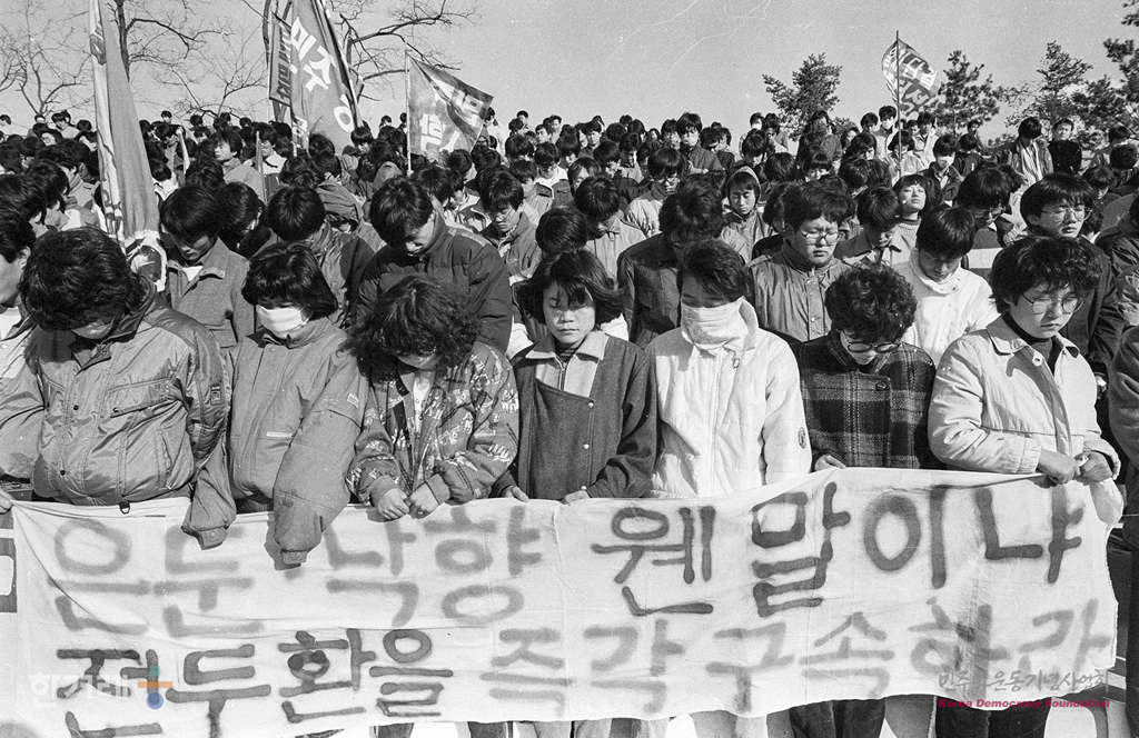 - 1988년 11월 25일 전두환씨의 사과 해명에도 불구하고 전씨 부부의 구속처벌을 요구하는 성명과 시위가 잇따르는 가운데 서울 연세대에서 학생 노동자 시민들이 전이부부 즉각구속과 노태우 정권규탄 제3차 국민궐기대회 출정식을 하고 있다.