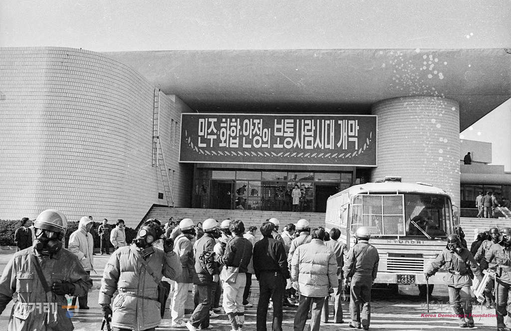- 1988년 11월 26일 오전 7시 15분 서울지역 총학생회연합과 수원지역대학생협의회 산하 애국결사대 소속 16개대 대학생 42명이 전두환 구속과 미제축출 등의 구호를 외치며 서울 송파구 가락동 민정당연수원 본관 옥상을 점거한 채 농성을 벌이고 있다. 이들은 4시간 30분 동안 농성을 벌이다 모두 경찰에 연행됐다.