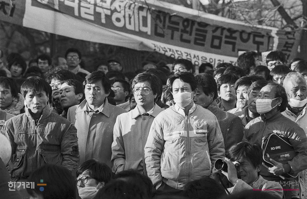 - 1988년11월 26일 전두환 이순자 즉각 구속과 노태우 정권규탄 제 3차 국민궐기대회가 서울 동숭동 대학로에서 열려 시민들이 규탄연설을 듣고 있다.