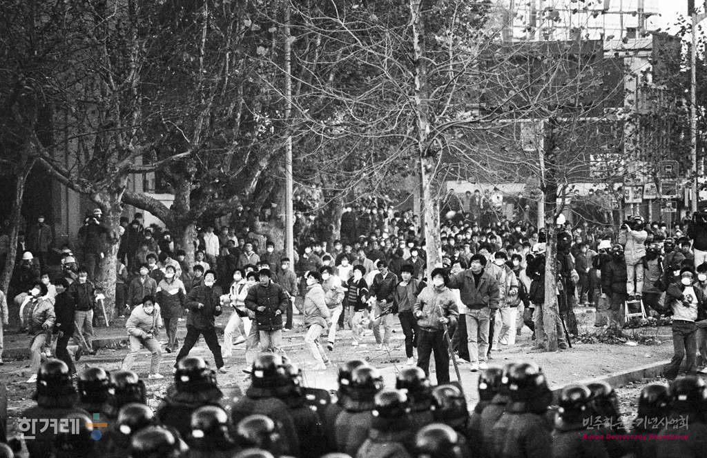 - 1988년11월 26일 서울 동숭동 대학로에서 열린 전두환 이순자 즉각 구속과 노태우 정권규탄 제 3차 국민궐기대회를 마친 시민들이 거리행진을 벌이다 경찰에 막혀 화염병을 던지며 저항하고 있다.