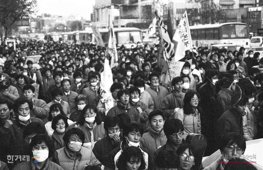 - 1988년11월 26일 서울 동숭동 대학로에서 열린 전두환 이순자 즉각 구속과 노태우 정권규탄 제 3차 국민궐기대회를 마친 시민들이 거리행진을 벌이다 경찰에 막혀 화염병을 던지며 저항하고 있다.