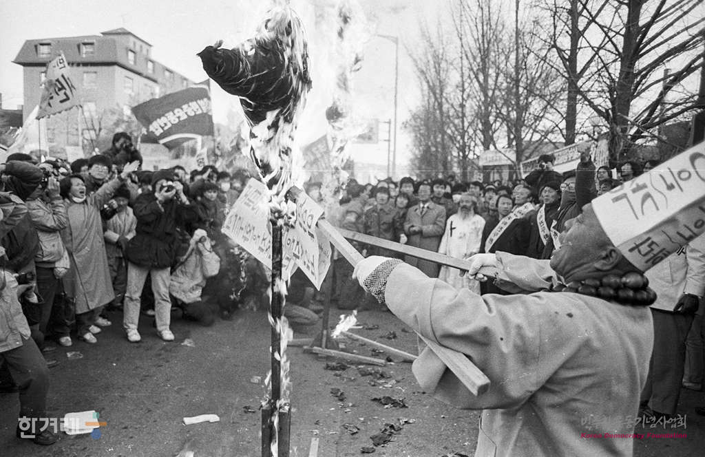 - 1988년11월 26일 서울 동숭동 대학로에서 열린 전두환 이순자 즉각 구속과 노태우 정권규탄 제 3차 국민궐기대회에서 참가자들이 전두환 노태우 미국 상징물 화형식을 하고 있다.