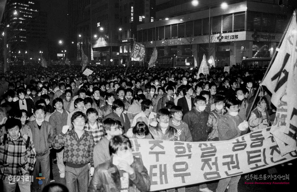 - 1988년11월 26일 서울 동숭동 대학로에서 열린 전두환 이순자 즉각 구속과 노태우 정권규탄 제 3차 국민궐기대회를 마친 시민들이 거리행진을 벌이고 있다.