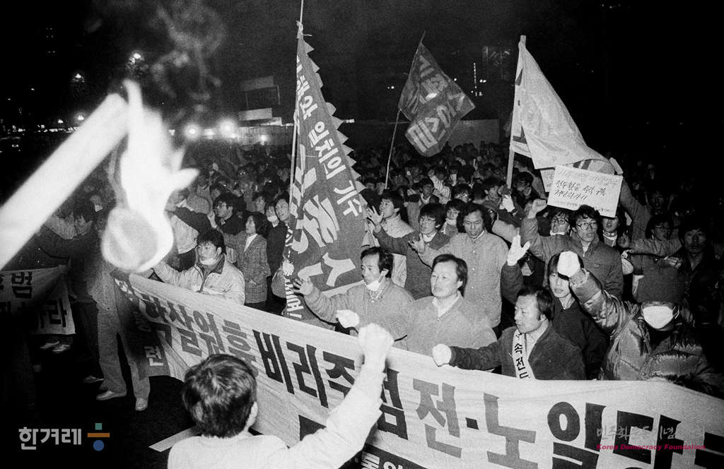 - 1988년11월 26일 서울 동숭동 대학로에서 열린 전두환 이순자 즉각 구속과 노태우 정권규탄 제 3차 국민궐기대회를 마친 시민들이 거리행진을 벌이고 있다.