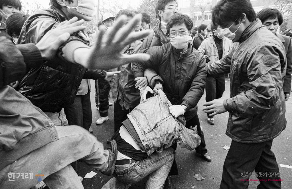 - 1988년11월 26일 서울 동숭동 대학로에서 열린 전두환 이순자 즉각 구속과 노태우 정권규탄 제 3차 국민궐기대회를 마친 시민들이 거리행진을 벌이다 경찰과의 실랑이를 벌이고 있다.