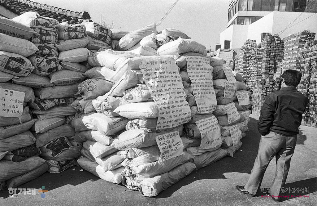 - 1988년 11월 28일 농민들이 고추 제값받기 운동에 야당정치인들의 관심을 촉구하며 평민당 김대중 총재 집앞에 쌓아놓은 고추 4백 부대가 3일째 오가는 이의 관심을 끌고 있다.