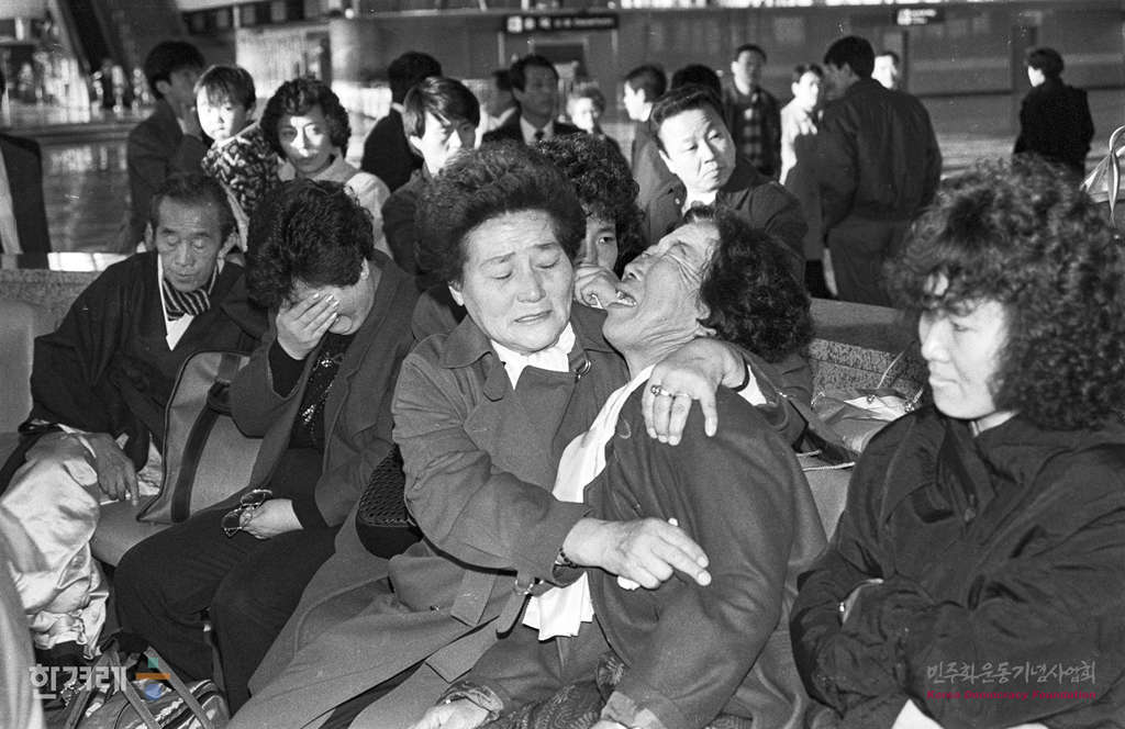 - 1988년 11월 28일 대한항공 858기 참사 1주기 추도식에 하기 위해 버마 안다만해역으로 떠나는 유족들이 김포공항 공항대기실에서 슬픔을 참지 못해 오열을 터뜨리고 있다.