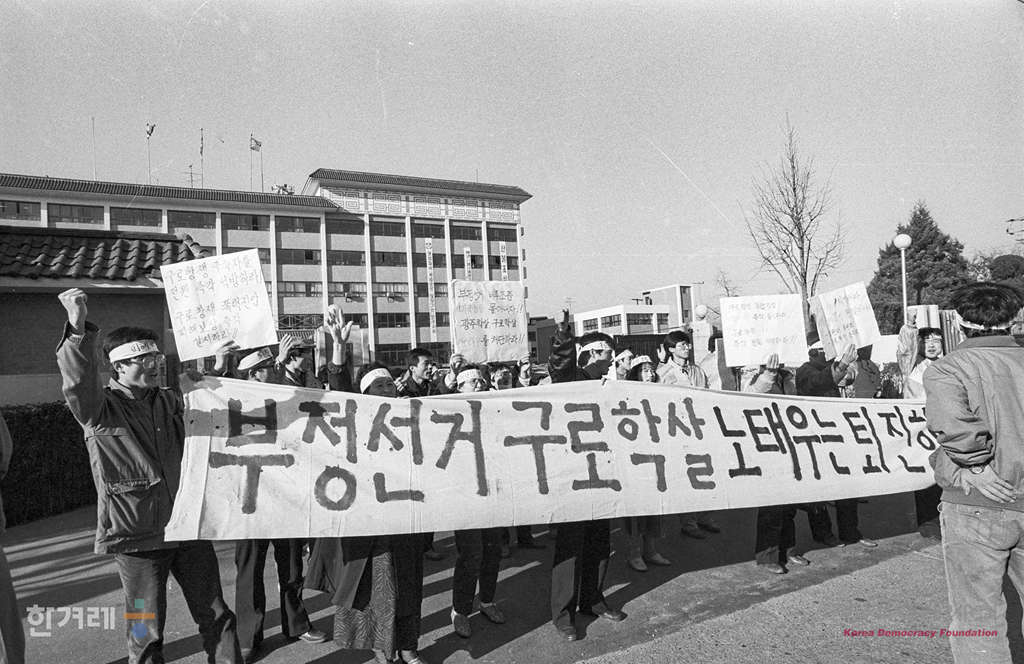 - 1988년 11월 28일 오후3시 지난해 12월 대통령선거 당시 구로구청 부정투표함 밀반출 항의 농성중 구로구청 5층 대강당에서 떨어져 부상을 당한 양원태씨가 국가를 상대로 낸 손해배상 청구소송 사건에 대한 현장검증이 열리는 서울 구로구청앞에서 양원태 후원회 회원들과 시민들이 시위를 벌이고 있다