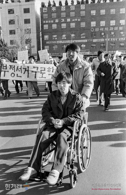 - 1988년 11월 28일 오후3시 지난해 12월 대통령선거 당시 구로구청 부정투표함 밀반출 항의 농성중 구로구청 5층 대강당에서 떨어져 부상을 당한 양원태씨가 국가를 상대로 낸 손해배상 청구소송 사건에 대한 현장검증이 서울 구로구청 대강당에서 열려 휄체어를 타고 참석한 양원태씨가 후원회 회원들에게 인사를 하고 있다.