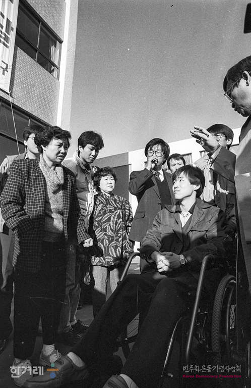 - 1988년 11월 28일 오후3시 지난해 12월 대통령선거 당시 구로구청 부정투표함 밀반출 항의 농성중 구로구청 5층 대강당에서 떨어져 부상을 당한 양원태씨가 국가를 상대로 낸 손해배상 청구소송 사건에 대한 현장검증이 서울 구로구청 대강당에서 열려 휄체어를 타고 참석한 양원태씨가 후원회 회원들에게 인사를 하고 있다.