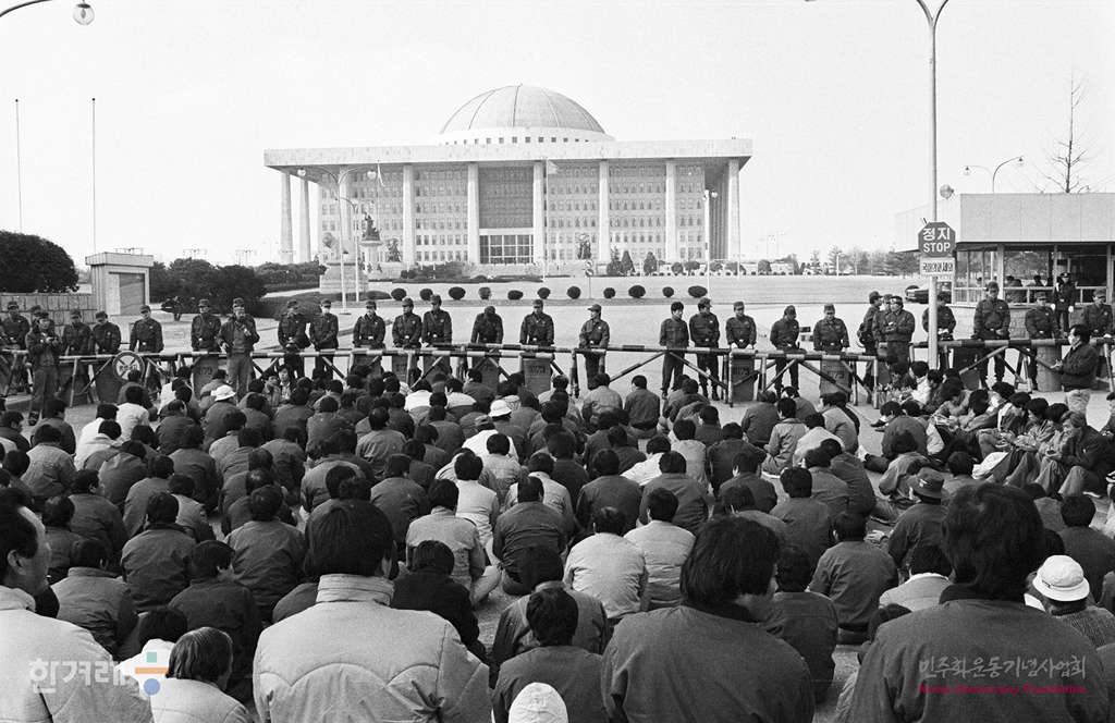 - 1988년 11월 29일 오후2시 한국노총은 서울 영등포구 여의도동 노총회당 8층강당에서 전국단위노조대표자 8백여명이 참석한 가운데 부당노동행위 규탄대회를 마친뒤 국회앞에서 시위를 벌이고 있다