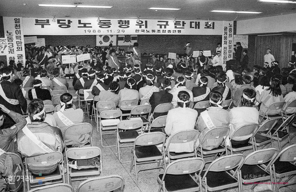 - 1988년 11월 29일 오후2시 한국노총은 서울 영등포구 여의도동 노총회당 8층강당에서 전국단위노조대표자 9백여명이 참석한 가운데 부당노동행위 규탄대회를 열고 삼성그룹의 노조결성 탄압행위를 규탄하고 삼성의 전제품 불매운동을 전개하겠다고 선언하고 있다.