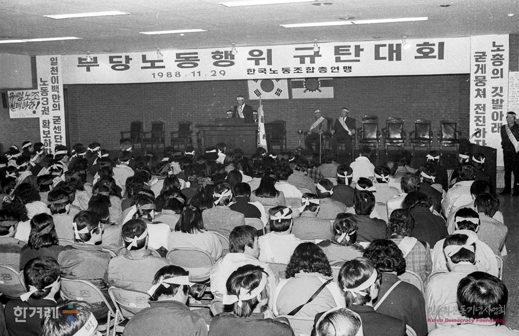 - 1988년 11월 29일 오후2시 한국노총은 서울 영등포구 여의도동 노총회당 8층강당에서 전국단위노조대표자 11백여명이 참석한 가운데 부당노동행위 규탄대회를 열고 삼성그룹의 노조결성 탄압행위를 규탄하고 삼성의 전제품 불매운동을 전개하겠다고 선언하고 있다.