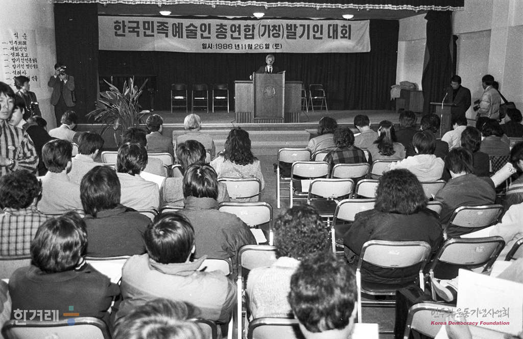 - 1988년 11월 26일 오후 3시 문학 미술 영화 연극 음악 등 8개 장르의 발기인 3백여 명이 참석한 가운데 한국민족예술인총연합 발기인대회가 서울 여의도 여성백인회관 강당에서 열리고 있다.