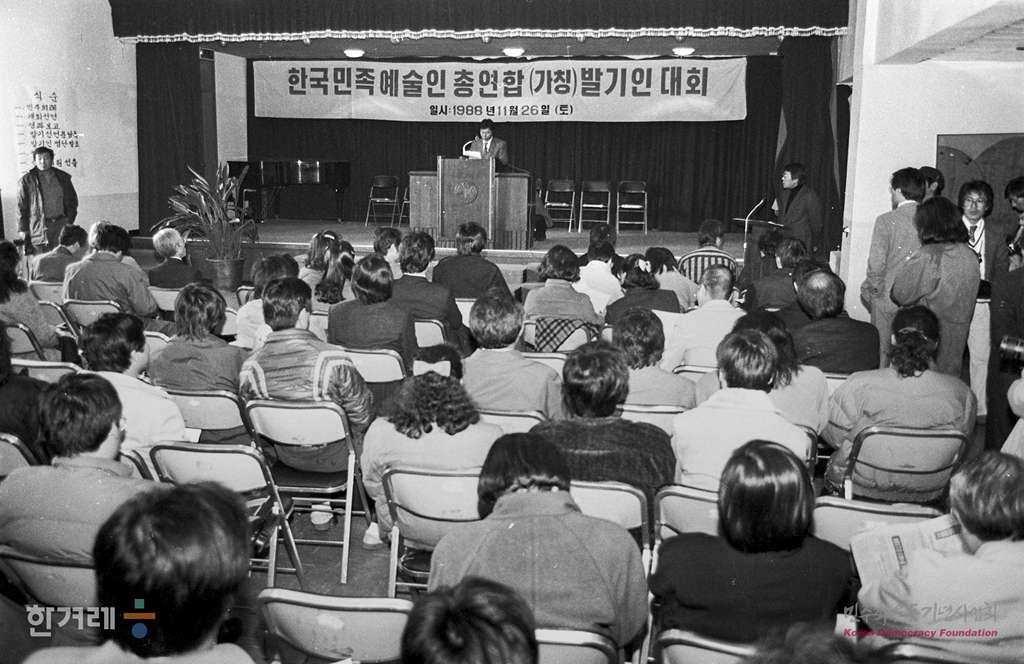 - 1988년 11월 26일 오후 3시 문학 미술 영화 연극 음악 등 8개 장르의 발기인 3백여 명이 참석한 가운데 한국민족예술인총연합 발기인대회가 서울 여의도 여성백인회관 강당에서 열리고 있다.