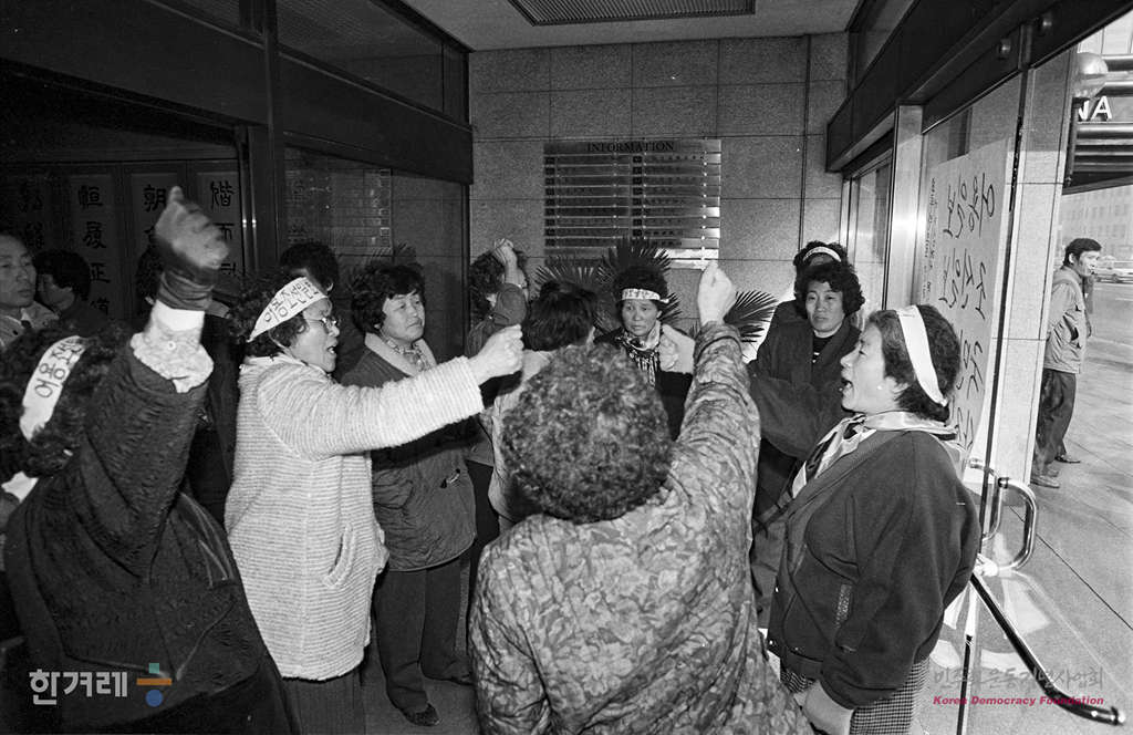 - 1988년 11월 29일 민주화실천가족운동협의회 산하 유가족협의회 의문사 유가족 대책협의회소속 회원들이 조선일보사 로비에서 지난 10월 27일 이한열열사 어머니와 삼양화학 한영자사장의 화해관련 기사에 대해 항의농성을 벌이고 있다