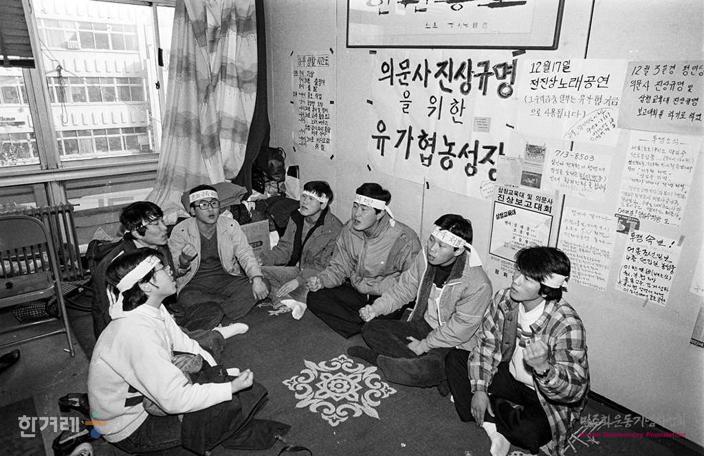 - 11988년 11월 30일 민주화실천가족운동협의회 산하 유가족협의회 의문사 유가족 대책협의회를 지원하는 대학생들이 서울 종로 기독교회관에서 의문사진상규명을 위한 농성을 하고 있다.